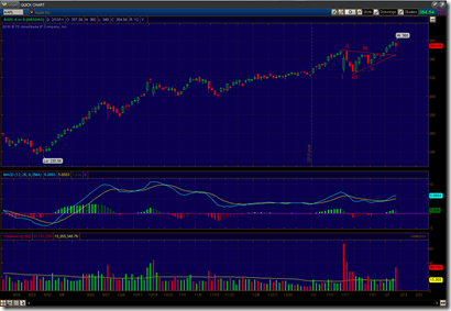 AAPL just completed a very nice triangle formation. I think this indicates that AAPL is about to start an extended downtrend. The upside target is 360-361, and could drop to $300 or lower.